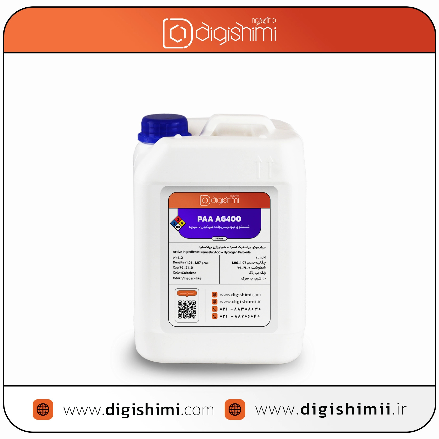 PAA AG400 یک محلول ضدعفونیکننده پیشرفته بر پایه «پراستیک اسید» است که با طیف اثر میکروبی بسیار گسترده، به طور اختصاصی برای شستشو و گندزدایی انواع میوهها و سبزیجات فرموله شده است. این محصول برای طیف وسیعی از محصولات کشاورزی، از جمله میوههای خام، محصولات تازه برشخورده (Fresh-cut) و محصولات بلافاصله پس از برداشت، کاربرد دارد.